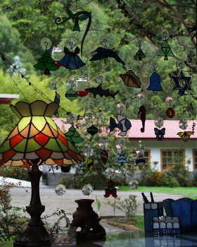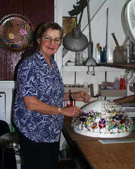 Soldering the glass into cunning lead frames (and sometimes burning herself into the bargain), she fashions mobiles, hanging ornaments and figurines. Her imagination often goes beyond her environment into Christmas themes, fishes, stars of David, and pure whimsy. When we visited her studio recently, she was busy with her most ambitious project to date - a sizeable Tiffany lamp.